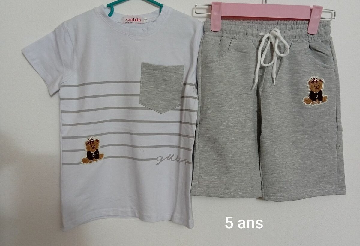 Adorable ensemble pour enfants comprenant un t-shirt blanc à rayures et un short gris. Accents amusants d'oursons ajoutent une touche ludique. Parfait pour les aventures estivales des petits explorateurs ! 5 ans
