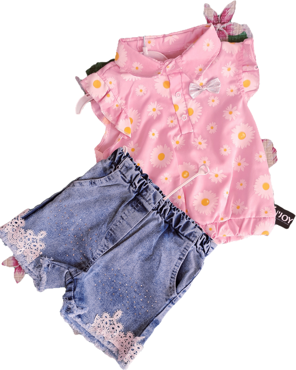 Cet ensemble adorable comprend un haut à fleurs roses et un short en jean . Idéal pour les journées estivales, il offre confort et style avec une touche florale. Parfait pour les sorties décontractées ou les fêtes en plein air.
