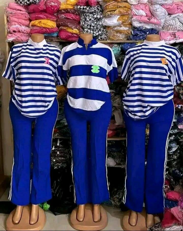 Ensemble deux pièces pour femme, composé d'un haut rayé bleu et blanc et d'un pantalon bleu. Confortable et élégant, idéal pour les occasions décontractées.