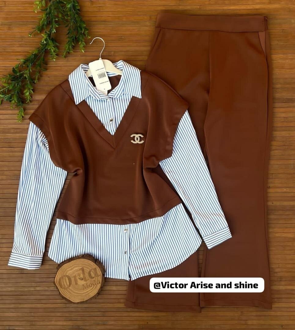 Adoptez un style chic avec cet ensemble femme comprenant un chemisier rayé et un pull sans manches brun. Parfait pour une tenue de bureau ou une sortie décontractée. Confort et élégance garantis. Idéal pour la femme moderne cherchant à combiner style et confort au quotidien.