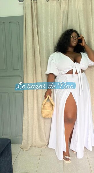 Ensemble femme, jupe longue et haut, imprimé floral rouge et blanc