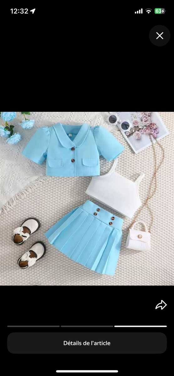 Élégant ensemble pour fille avec veste bleue, top blanc et jupe plissée. Idéal pour des occasions spéciales ou sorties estivales. Matière confortable et design moderne pour un look adorable.