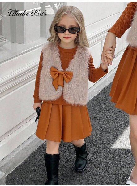 Charmant ensemble pour fille comprenant un pull sans manches rose, une chemise blanche et une jupe écossaise. Parfait pour les occasions spéciales ou pour un look chic au quotidien. Matériaux doux et confortables.