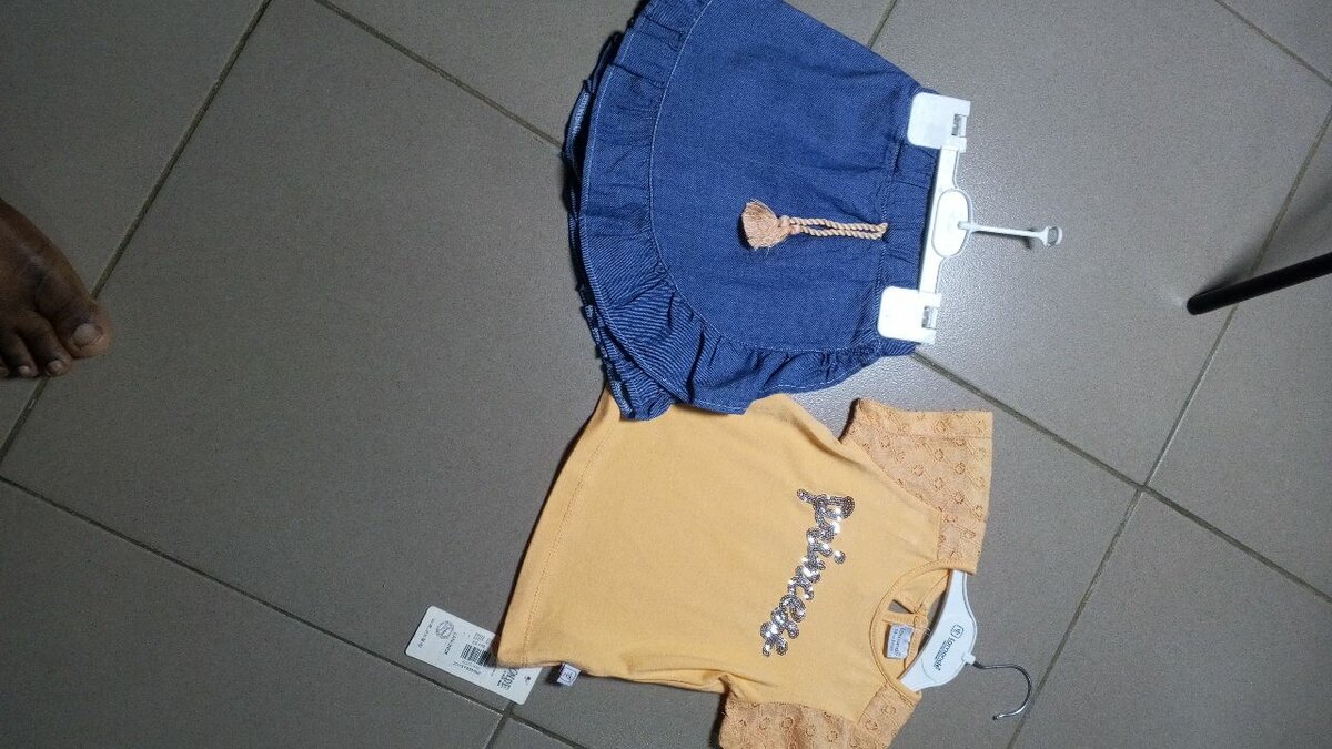 Ensemble charmant pour fille avec jupe en jean bleue et haut jaune avec dentelle. Idéal pour les sorties décontractées et les événements spéciaux. Confortable et élégant, il est parfait pour offrir un look mignon et tendance à votre petite.