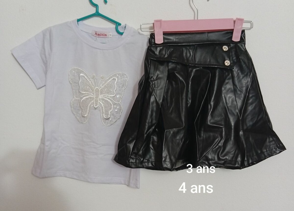 Ensemble tendance pour filles comprenant un t-shirt blanc avec un papillon scintillant et une jupe taille haute en similicuir noir. Parfait pour les occasions spéciales et sorties décontractées. Disponible en tailles 3 et 4 ans.
