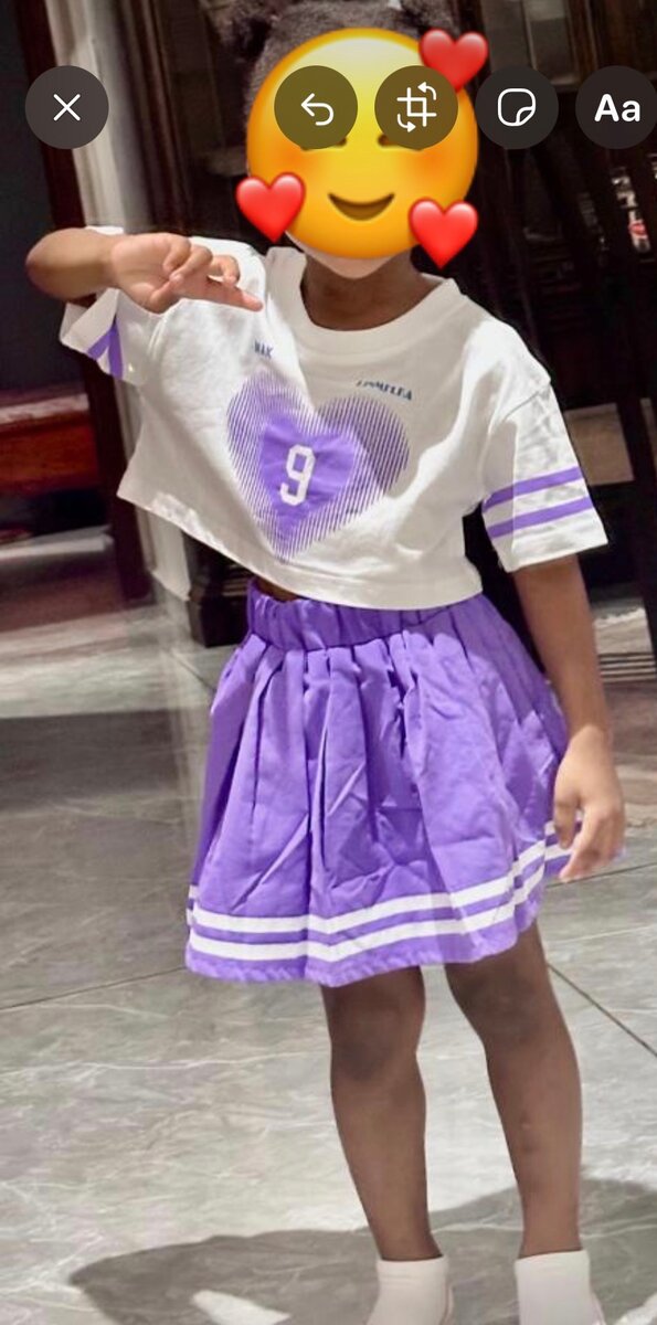Ensemble pour fille composé d'un T-shirt blanc avec un cœur violet et d'une jupe violette. Idéal pour une tenue décontractée et élégante.