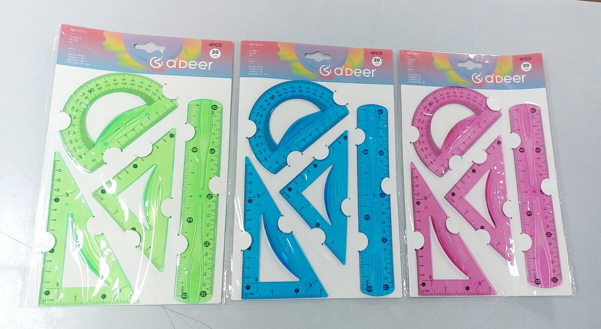 Ensemble géométrique flexible 20 cm, idéal pour l'école ou le bureau. Comprend une règle, deux équerres et un rapporteur, parfait pour des mesures précises. Design vibrant disponible en vert, bleu et rose, ajoutant une touche de fun à vos fournitures.