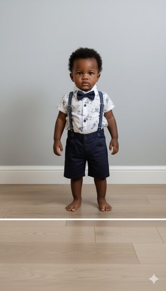 Optez pour cet ensemble chic pour garçon, parfait pour des occasions spéciales. Composé d'une chemise à motif, d'un short à bretelles et d'un chapeau assorti, il offre un look charmant et sophistiqué. Idéal pour des cérémonies ou des sorties élégantes !