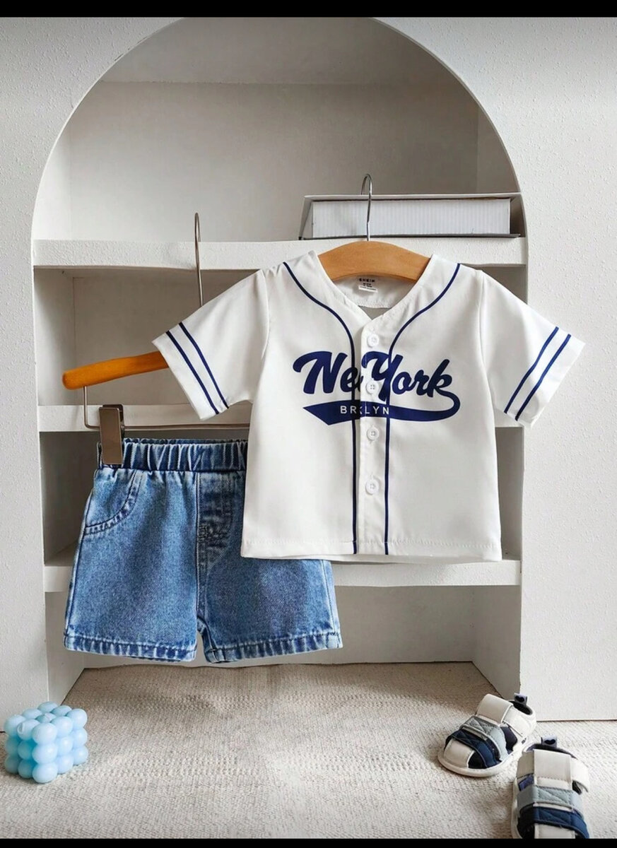 Adoptez un look tendance pour votre garçon avec cet ensemble d'été inspiré du style sportif. Comprend un t-shirt blanc avec imprimé 'New York' et un short en jean bleu. Idéal pour des sorties décontractées ou des après-midis en plein air. Leger et confortable, cet ensemble est parfait pour les journées ensoleillées.