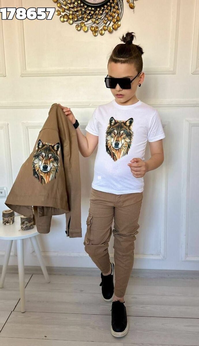 Parfait pour les grandes occasions , cet ensemble stylé comprend un t-shirt blanc et un pantalon beige, tous ornés d'un impressionnant motif de loup. Confortable et tendance, idéal pour toutes occasions.