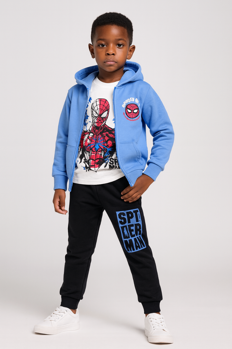 Adoptez le look super-héros avec cet ensemble Spider-Man pour garçon. Comprend un sweat à capuche bleu, un t-shirt imprimé et un pantalon confortable. Idéal pour un usage quotidien et les fans de Marvel.