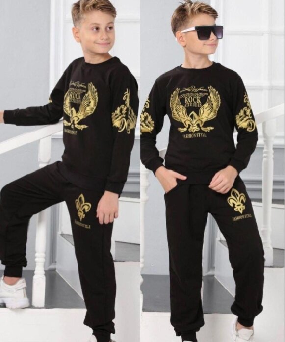 Découvrez cet ensemble tendance pour garçons avec son design rock et ses motifs dorés audacieux. Idéal pour un look casual et stylé, fait en matériaux confortables et durables, parfait pour toutes les occasions.
