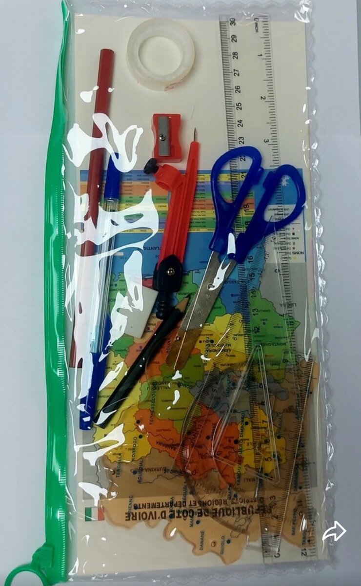 Ensemble composé de règle 30cm ,équerre, rapporteur, compas, gommes,crayon,taille-crayon,..