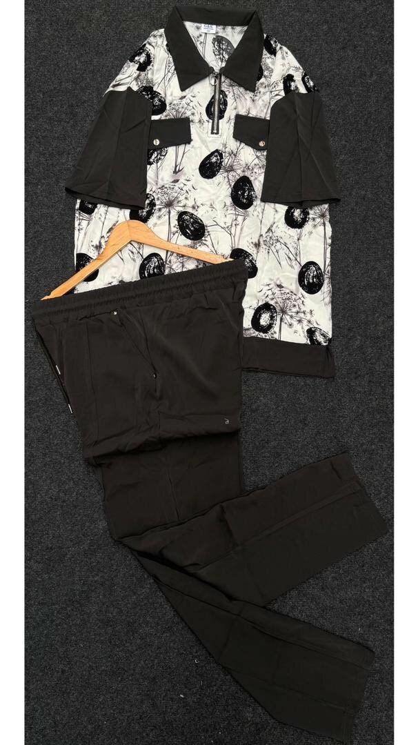 Ensemble homme chic et moderne. Chemise à motifs avec col et poignets noirs, pantalon noir ajusté. Idéal pour les occasions spéciales ou le quotidien élégant.