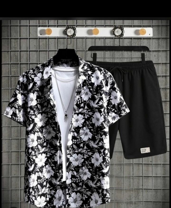 Chemise à fleurs pour homme avec short noir. Parfait pour un look décontracté et tendance. Idéal pour les vacances ou les sorties en ville.