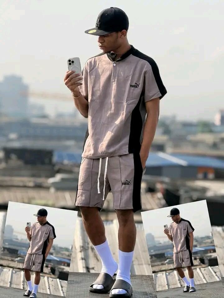 Ensemble homme comprenant un polo et un short assortis, de couleur gris avec des accents noirs. Idéal pour les activités sportives ou les sorties décontractées. Conçu pour un confort optimal.
