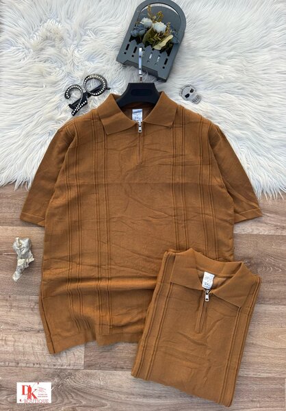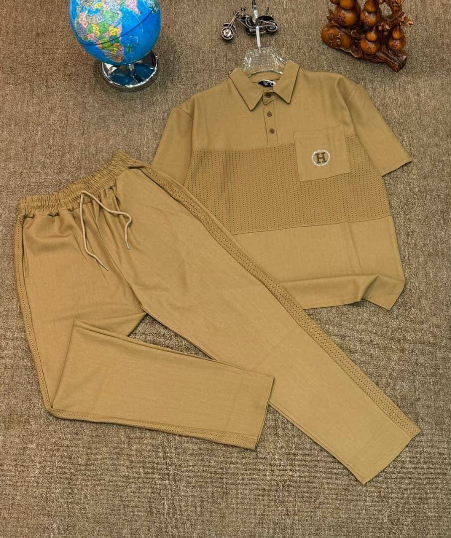 Ensemble homme composé d'un pantalon de jogging et d'un polo beige. Confortable et élégant, parfait pour les activités quotidiennes ou les sorties décontractées. Tissu de qualité, design moderne.