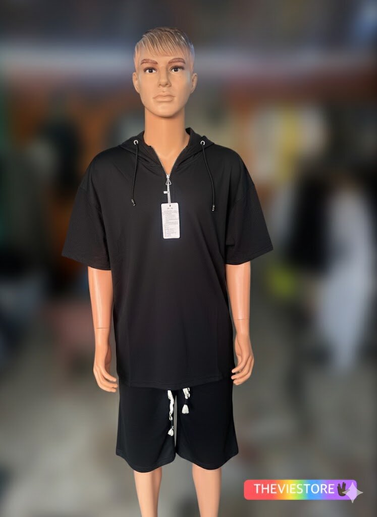 Ensemble homme chic et décontracté composé d'un polo noir à capuche et de shorts coordonnés. Idéal pour les journées décontractées ou les sorties en ville. Confortable et élégant.