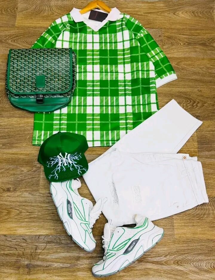 T-shirt vert à carreaux, pantalon blanc, chaussures blanches et vertes, sac et casquette verts. Ensemble décontracté et tendance pour homme.