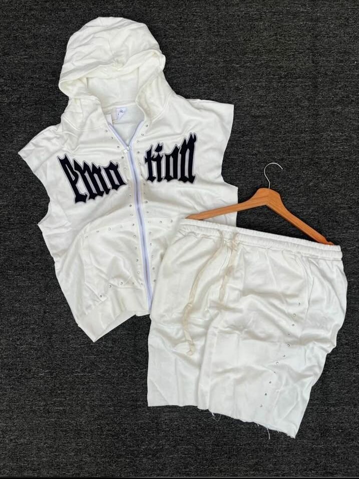 Ensemble homme élégant et décontracté comprenant une veste sans manches à capuche et un short assorti. Disponible en plusieurs couleurs. Confortable et idéal pour les activités décontractées.