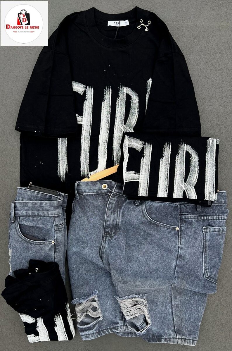 Cet ensemble comprend un t-shirt noir à imprimé moderne et un jean effet déchiré. Parfait pour un look décontracté et à la mode. Idéal pour les sorties en ville ou une journée détente. Un choix stylé pour ceux qui aiment se démarquer avec une touche urbaine.