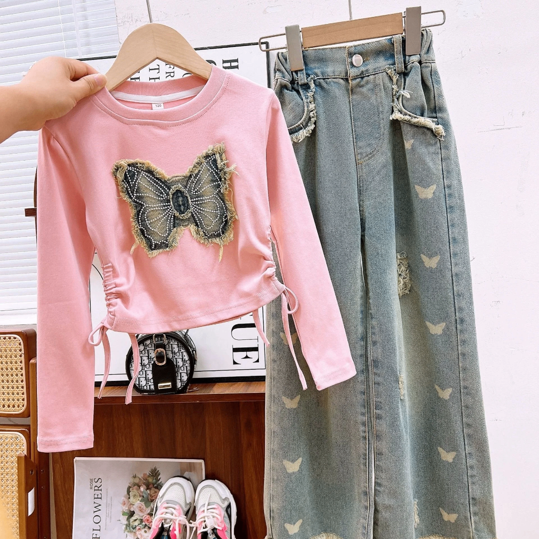 Craquez pour cet ensemble pour fille composé d'un haut rose avec un motif papillon et une jupe en jean décorée. Idéal pour un look tendance et confortable au quotidien, ce set est parfait pour les petites fashionistas de 7 à 10 ans.