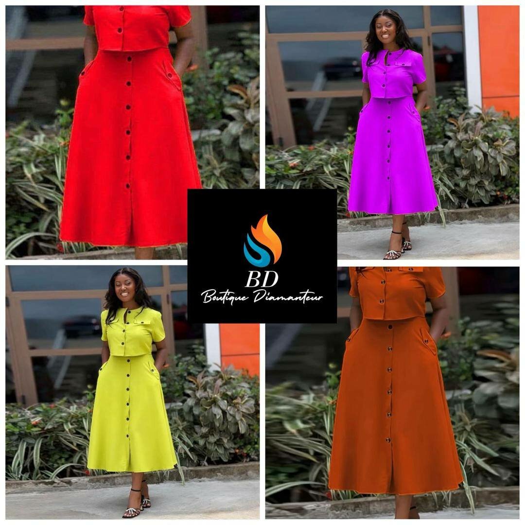 Ensemble élégant pour femmes comprenant une jupe mi-longue et un haut assorti. Disponible en plusieurs couleurs : rouge, violet, jaune et orange. Conçu pour un look chic et moderne.