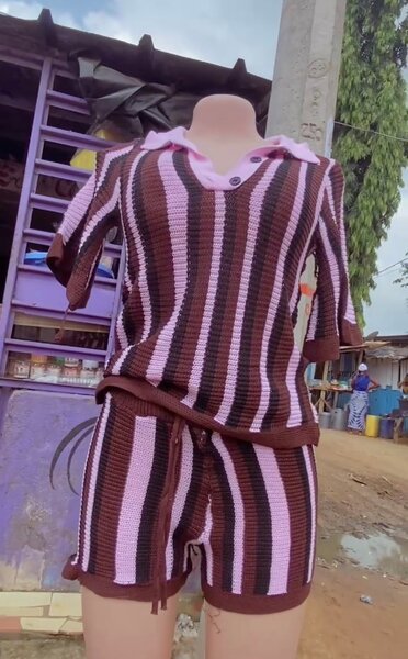 Ensemble jupe et haut rayé en tricot rose et blanc. Élégant et confortable, idéal pour une tenue décontractée ou semi-formelle. Parfait pour les femmes qui aiment les vêtements à la mode et confortables.