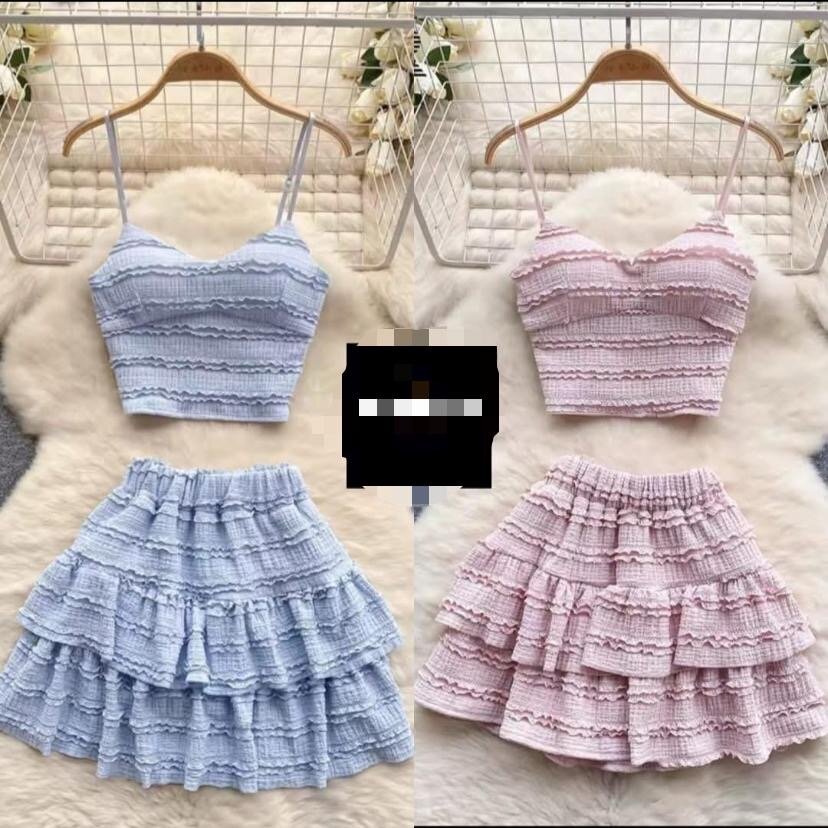 Découvrez cet ensemble élégant composé d'un top à bretelles et d'une jupe à volants en dentelle. Parfait pour les sorties estivales ou les soirées spéciales. Disponible en bleu et rose, cet ensemble est conçu pour celles qui cherchent le parfait équilibre entre confort et style.