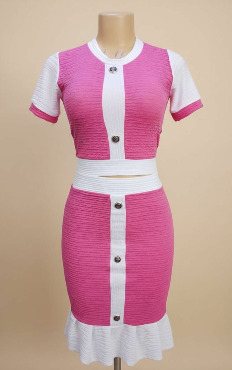 Élégant ensemble rose et blanc. Confection parfaite pour événements chics ou décontractés. Matériaux confortables pour un style assuré.