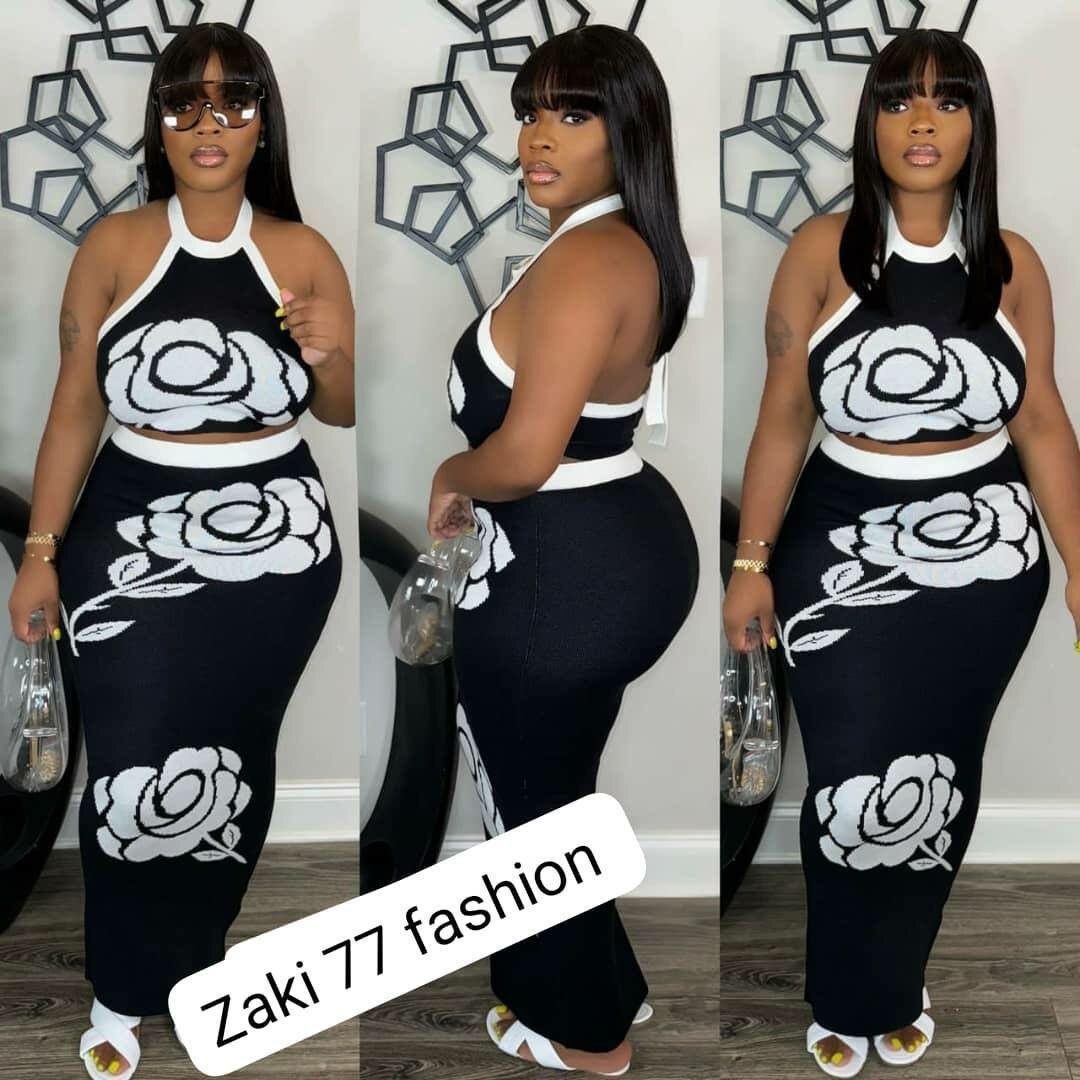 Élégant ensemble jupe et haut noir orné de motifs floraux blancs. Idéal pour des occasions spéciales ou des sorties décontractées. Mettez en valeur votre style avec cette tenue tendance et confortable, parfaite pour attirer tous les regards.
