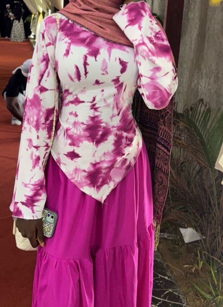 Élégante 2 pièce longue avec un motif effet tie-dye violet, idéal pour les occasions décontractées et chic. Son design unique asymétrique attire l'attention et offre un style bohème moderne. Parfaite pour un look distingué.