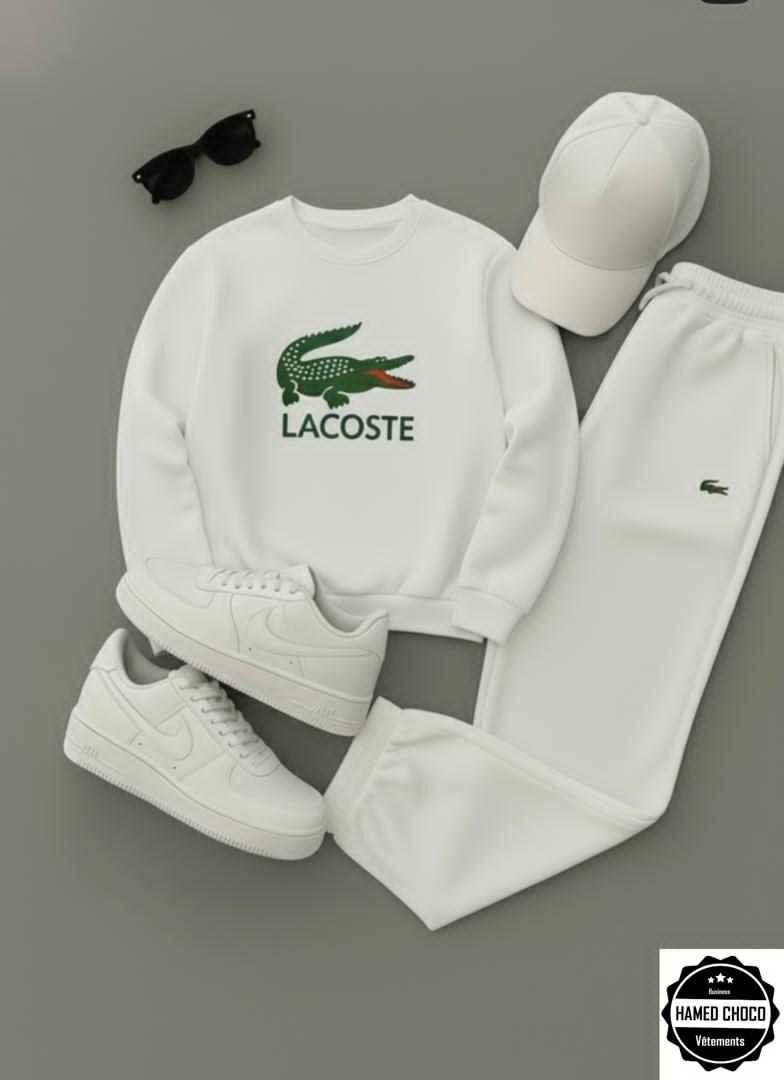 Découvrez cet ensemble blanc signature Lacoste : sweat stylé, pantalon confortable, casquette et baskets assortis. Idéal pour un look moderne et décontracté. Parfait pour le quotidien ou les sorties urbaines, avec une allure élégante et sportive.