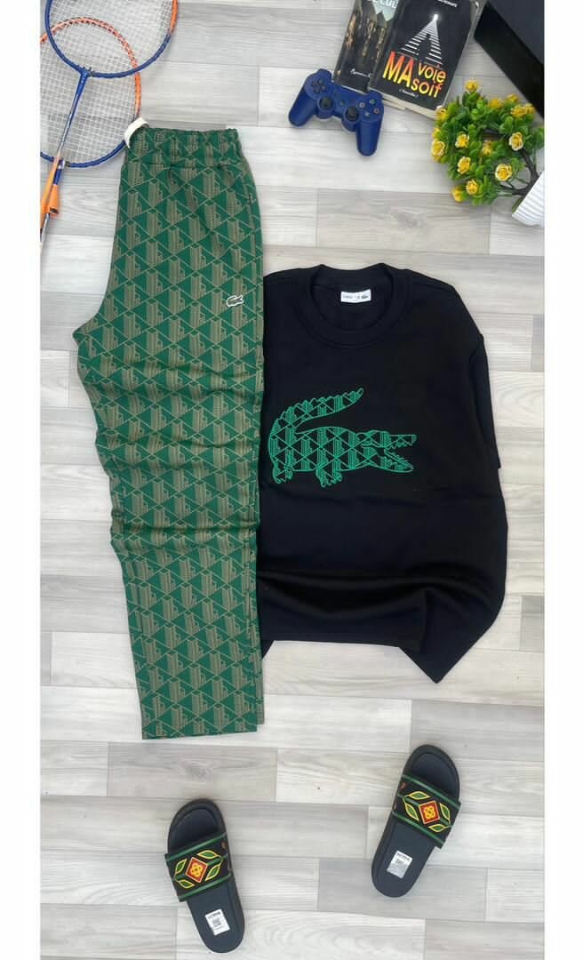 Découvrez cet ensemble Lacoste pour homme, composé d'un pantalon et d'un sweat assortis, accompagnés de sandales confortables. Style décontracté et élégant.