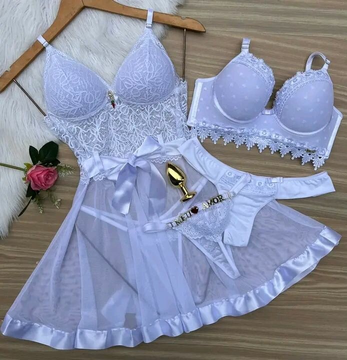 Ravissant ensemble de lingerie blanche comprenant un soutien-gorge en dentelle, un haut élégant et une culotte coordonnée. Idéal pour des moments spéciaux, cette pièce procure confort et allure séduisante. Parfait pour des occasions romantiques ou un cadeau inoubliable.