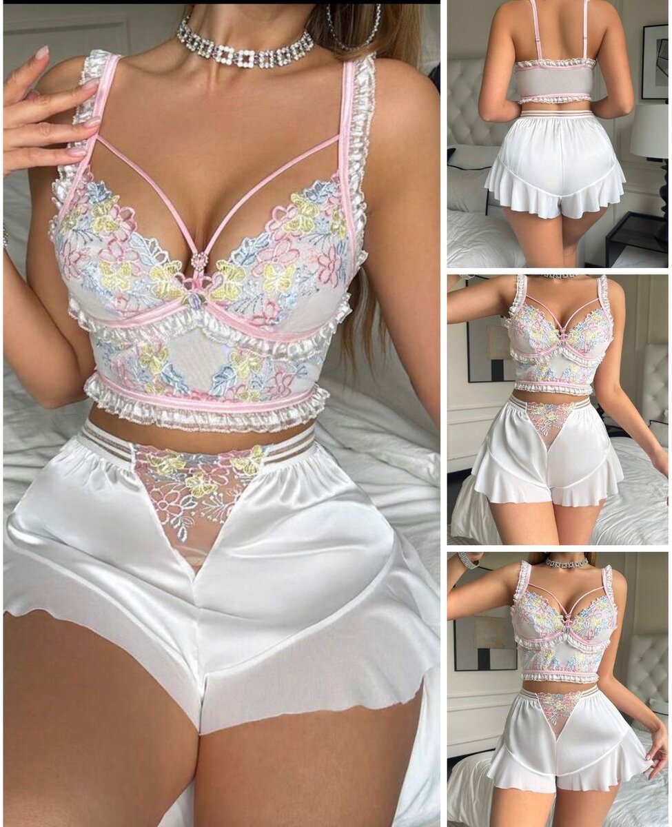 Parure de lingerie féminine en dentelle et satin. Broderies florales délicates. L'ensemble comprend un soutien-gorge et un shorty. Tissu confortable et élégant.