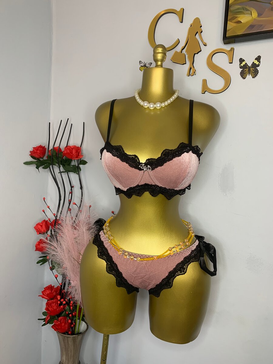 Découvrez notre ensemble de lingerie rose, délicatement orné de dentelle noire. Parfait pour des occasions spéciales ou pour se sentir irrésistible au quotidien. Fabriqué dans un matériau doux pour un confort optimal.
