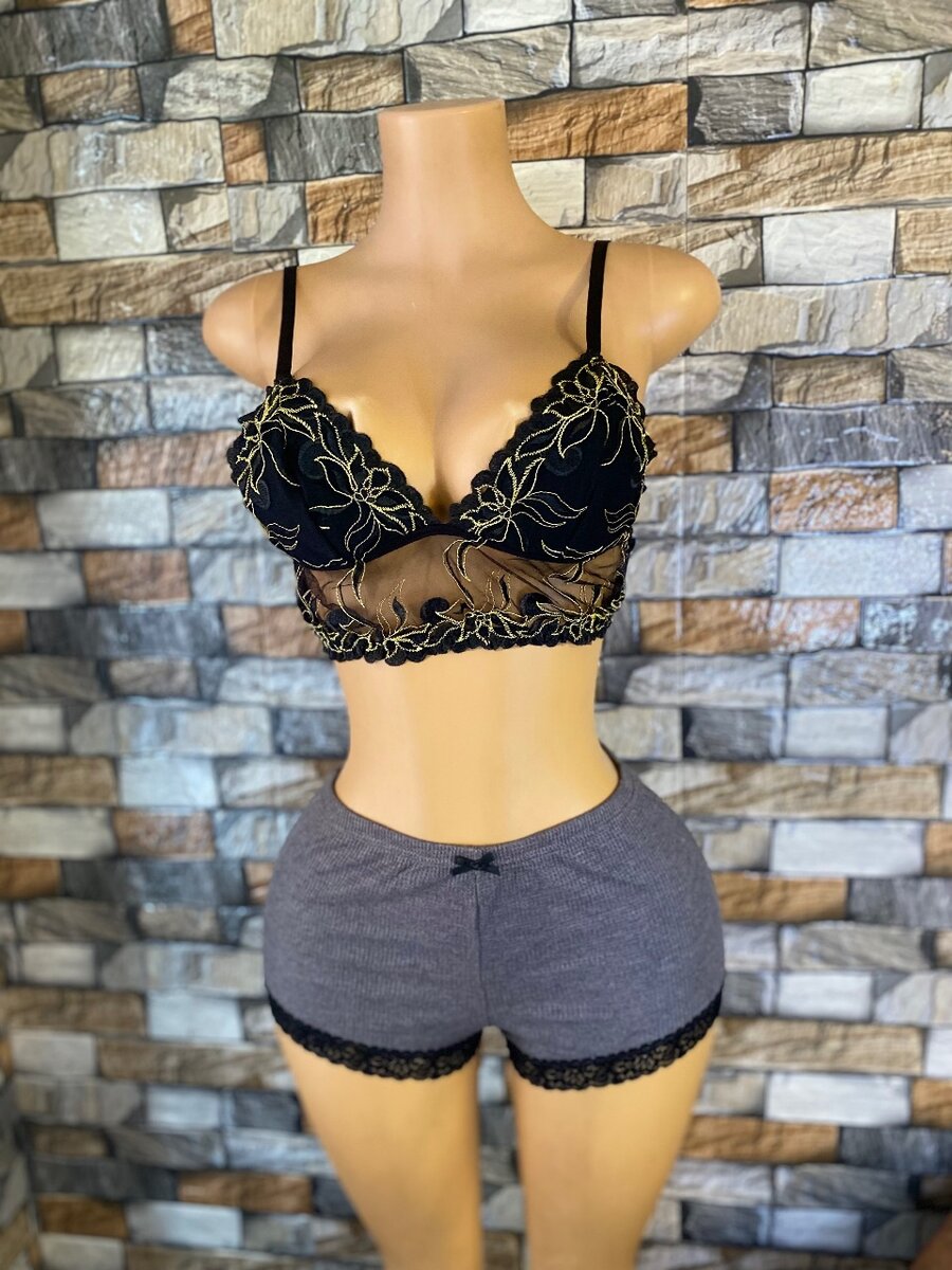 Découvrez cet ensemble de lingerie en dentelle noir et gris, conçu pour allier confort et séduction. Le haut avec des bretelles délicates et des détails floraux, combiné avec un shorty ajusté, offre un style unique et élégant. Idéal pour des occasions spéciales ou un usage quotidien. Sentez-vous belle et confiante!
