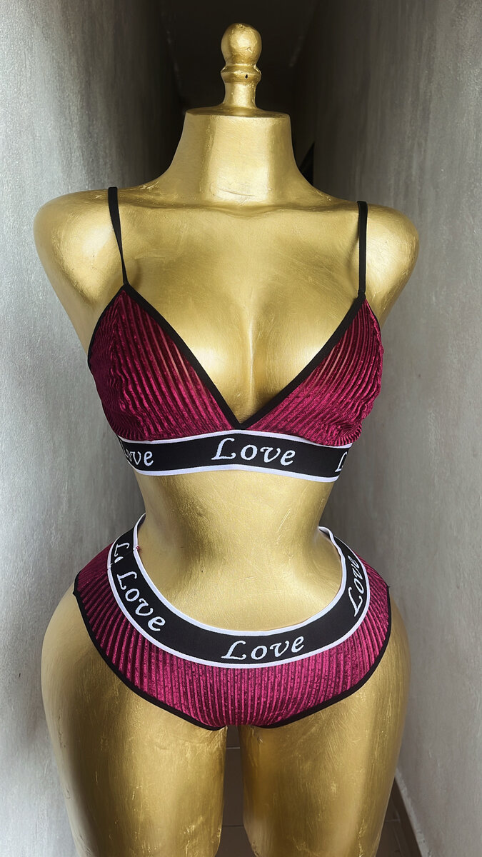 Découvrez cet ensemble lingerie "Love", comprenant un soutien-gorge et une culotte en velours rouge. Confortable et élégant, il est parfait pour des moments intimes ou pour se sentir confiante au quotidien. Matière douce et design moderne.