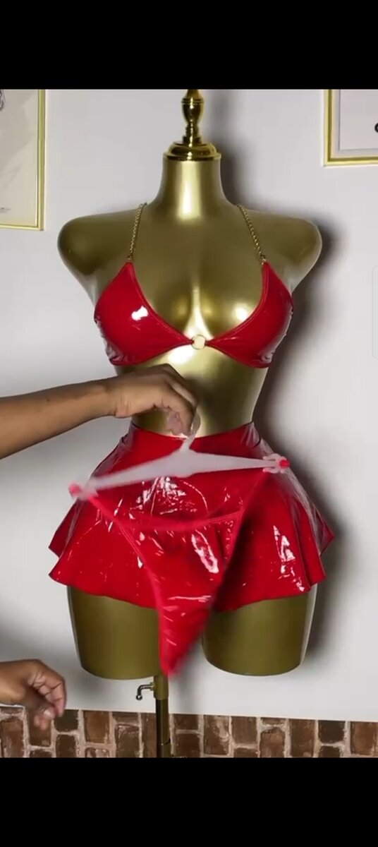 Découvrez cet ensemble de lingerie rouge en vinyle pour un look audacieux et séduisant. Avec sa coupe glamour et ses détails dorés, il est parfait pour des occasions spéciales ou pour se sentir confiante et sexy au quotidien.