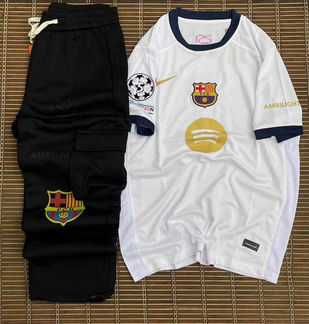 Composé dun jogging beige tendance avec bandes rouge et bleue + un maillot blanc gold édition spéciale, ce set est parfait pour briller en ville ou entre amis