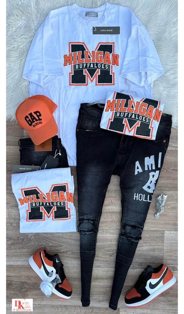 Cet ensemble tendance combine style et confort. Comprend un t-shirt imprimé, un jean déchiré chic et des baskets assorties. Parfait pour une allure urbaine et moderne.