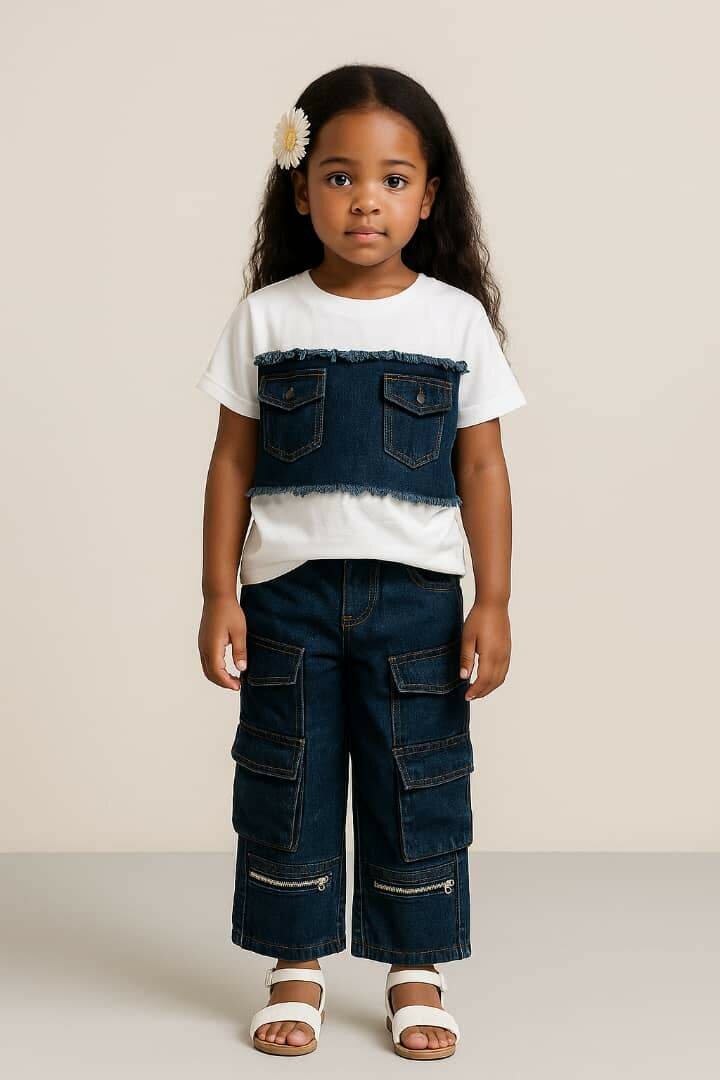 Ensemble tendance pour enfants avec haut blanc et détails en denim, complété par un pantalon cargo denim. Parfait pour un look décontracté et stylé.