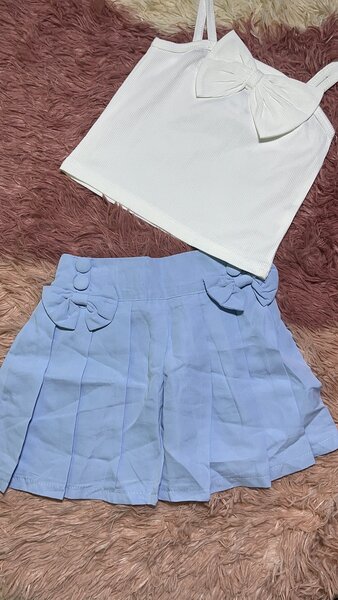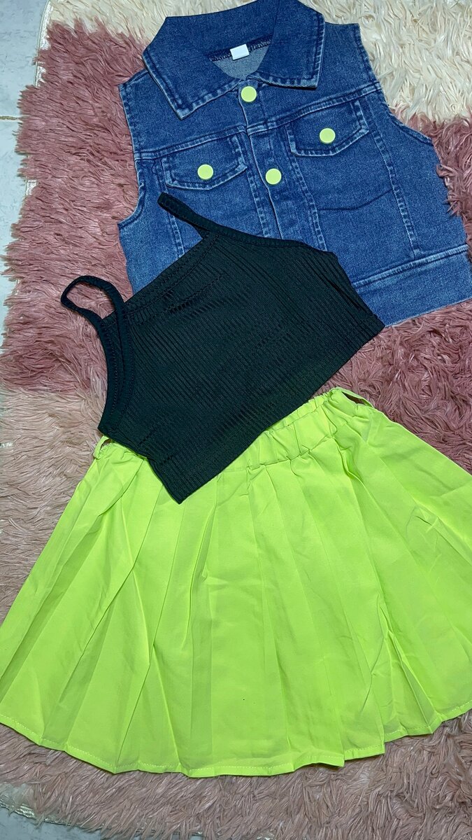 Ensemble tendance pour fillette avec jupe colorée, débardeur noir et veste en denim. Parfait pour un look estival stylé et confortable. Idéal pour sorties et occasions spéciales.