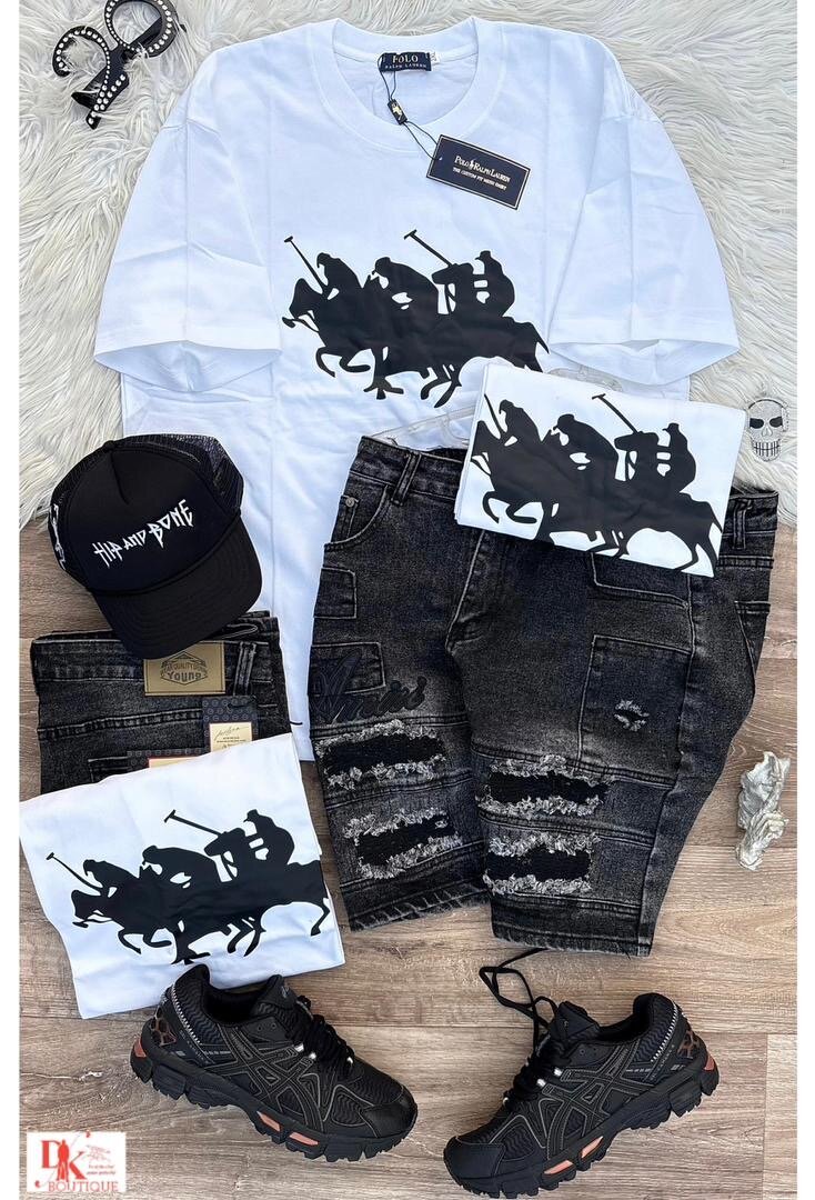 Adoptez un style urbain unique avec cet ensemble homme comprenant un t-shirt à imprimé équestre, short jeans tendance, casquette, et baskets noires. Parfait pour affirmer votre personnalité avec allure et confort.