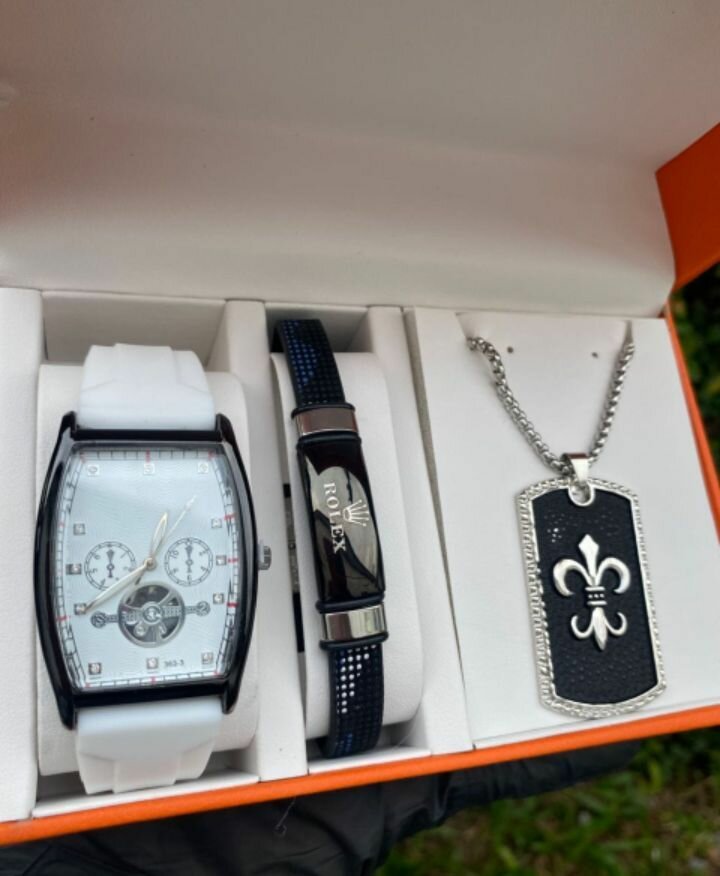 Découvrez notre ensemble élégant pour homme, comprenant une montre moderne, un bracelet en cuir et un collier pendentif en argent. Parfait pour les occasions spéciales ou comme cadeau.