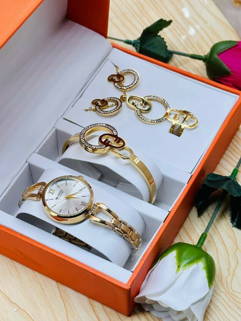 Découvrez ce magnifique ensemble montre et bijoux doré, parfait pour ajouter une touche d'élégance à toute tenue. Comprend une montre raffinée et des bijoux assortis. Parfait pour les occasions spéciales ou comme cadeau élégant.