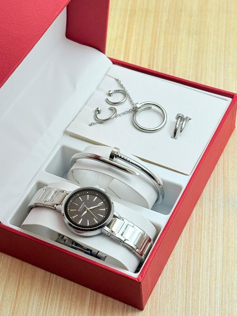 Découvrez notre ensemble comprenant une montre élégante et des bijoux assortis. Parfait pour les occasions spéciales ou pour ajouter une touche d'élégance à votre quotidien. Choisissez votre couleur préférée pour compléter votre style unique. Idéal comme cadeau raffiné pour vous-même ou un être cher.