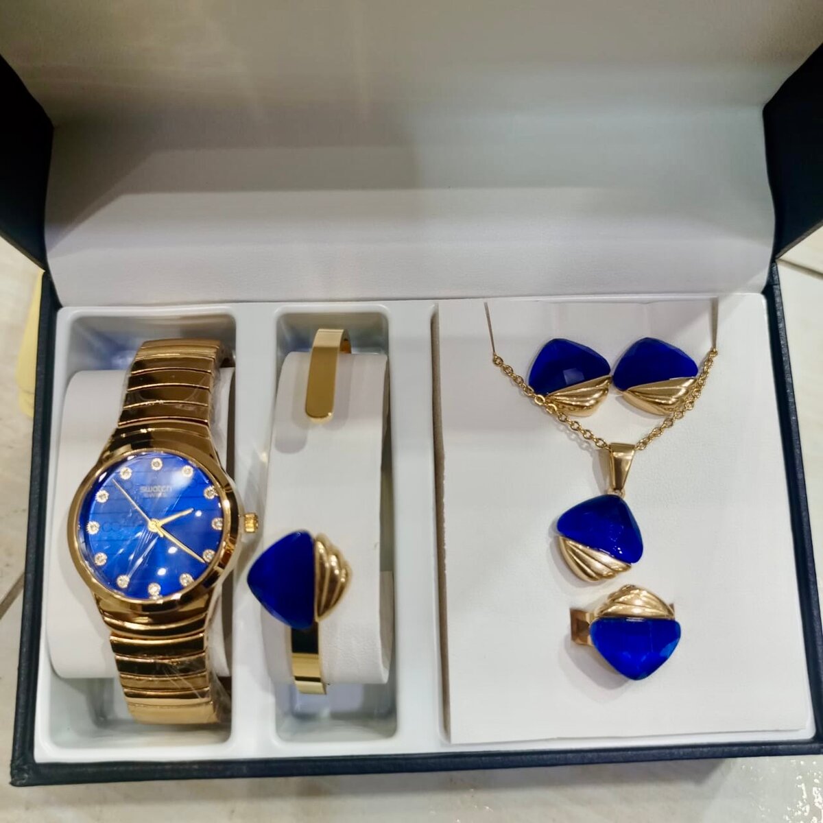 Cet ensemble élégant comprend une montre et des bijoux en or, parfait pour les femmes qui aiment le luxe. Chaque pièce est soigneusement présentée dans un coffret, idéale pour les occasions spéciales ou comme cadeau.