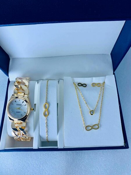 Coffret luxe avec montre, bracelets et colliers en or. Un cadeau élégant et raffiné pour elle. Parfait pour les occasions spéciales.